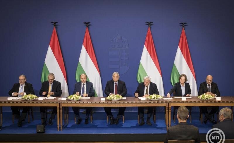 Orbán Viktor gratulált a munkaadóknak és a munkavállóknak a megállapodás tető alá hozásáért, és hangsúlyozta: a kormány szívesen írja alá ezt, mert a megállapodás nem tér el a munkaalapú társadalom megteremtésének nagy tervétől, ami a kabinet lépéseit már 15 éve vezeti.