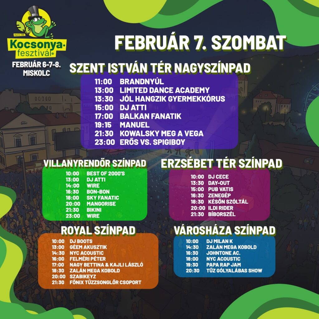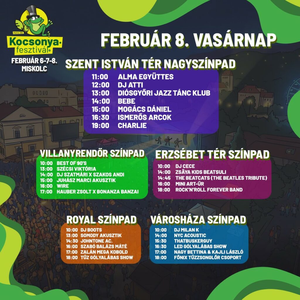 2 nagyszínpadon és 3 további színpadon közel 100 koncert, bőséges étel- és italkínálat, reggeltől egészen késő estig tartó programkavalkád és pezsgő vásári hangulat vár február 6–8. között, Miskolc belvárosában.