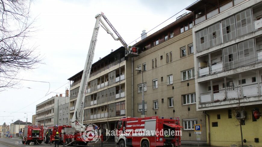 Kigyulladt egy négyszintes társasház tetőszerkezete pénteken Miskolcon, a Bajcsy-Zsilinszky úton.