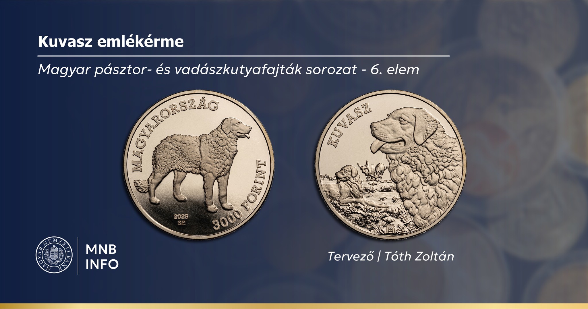 A Magyar Nemzeti Bank az állatok világnapjához kötődően új, 3000 forint névértékű színesfém emlékérmét ad ki, amely a magyar kuvaszt ábrázolja.